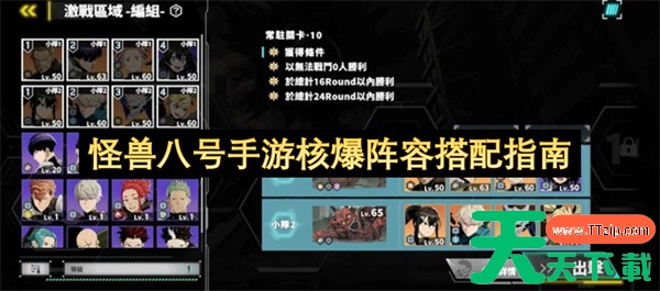 怪兽八号还原了动漫之中的各种角色,玩家能够自由进行角色的搭配,帮助得到更加强大的能力,感受创意十足的放置回合制战斗,培养动漫之中的角色来完成冒险,天天下载Ttzip就为大家介绍一套核爆阵容,快来跟随天天下载Ttzip一起看看吧!