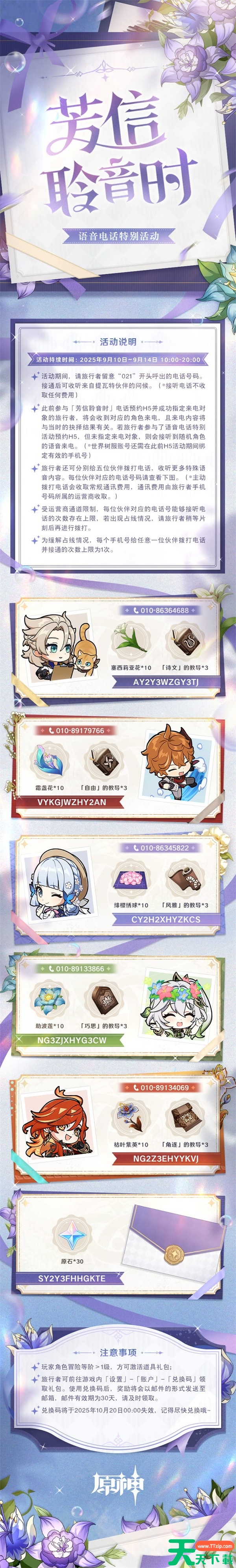 原神的芳信聆音时活动在2025年9月10日到9月14日进行,玩家能够聆听角色的语音电话,天天下载Ttzip就为大家详细带来活动的内容简介,帮助大家更好的进行游戏,快来跟随天天下载Ttzip一起看看吧!