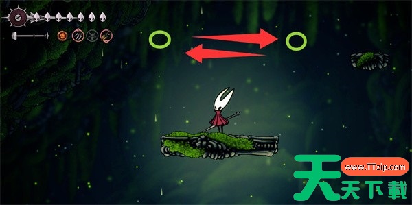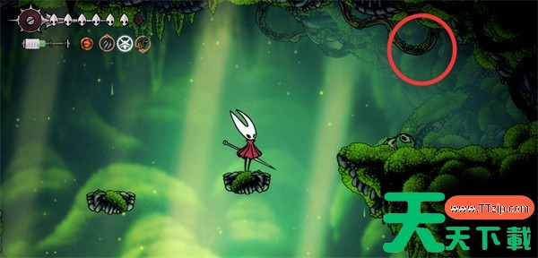 跳过两个浮空平台,进入上方藤蔓处即可发现。