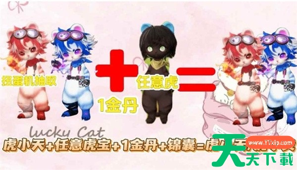 扭蛋机虎小天 + 任意虎宝 + 1金丹 + 锦囊 → 虎小天/虎小炎