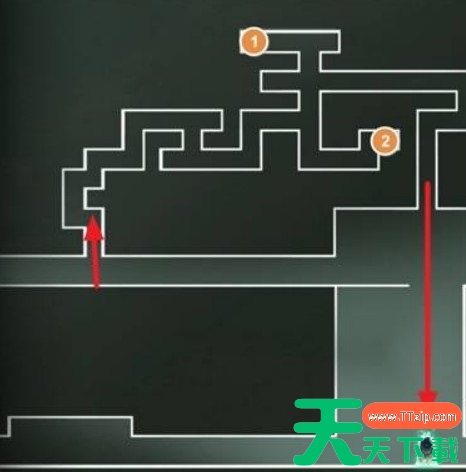 从石碑位置出发,沿右侧直行至边缘处,下方可见可攀抓的圆环。依次下落至最底部的圆环后,跳向左侧的隐藏通道。