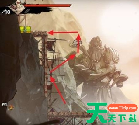 从宝箱所在建筑出来后,返回顶层并向右前进。按照下图路线前往右侧最高的平台,激活机关以解锁下方右侧的通道。随后通过该通道,即可进入全新区域。