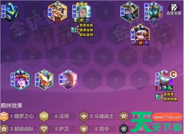 金铲铲之战S15六法卡尔玛如何搭配?最为新赛季强力的阵容,如何搭配才能发挥卡尔玛最大的实力,接下来天天下载Ttzip将从各个方面为你介绍,让你能够轻松的搭配,成功吃鸡。