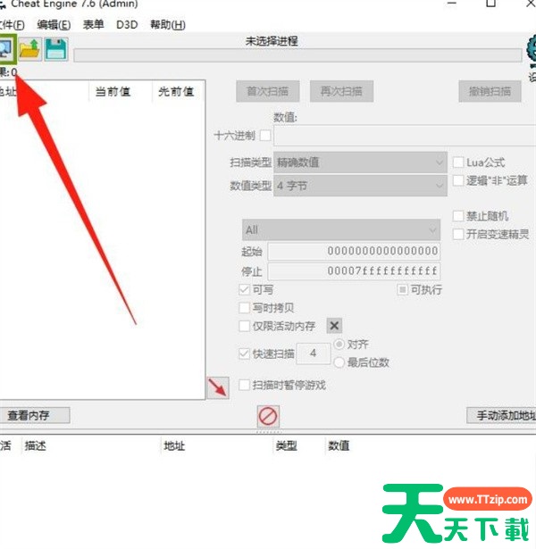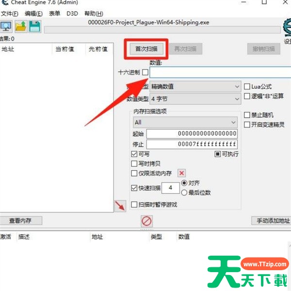 把你当前的金钱数填入右侧的“数值”栏,点击【首次扫描】。左边会出现大量地址。