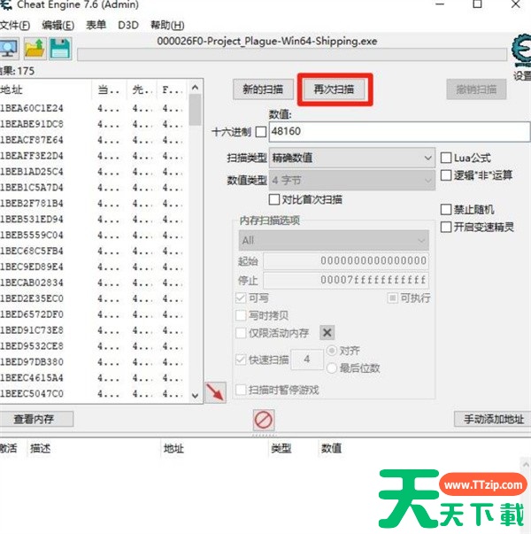 把变动后的金钱数值填写进CE,点击【再次扫描】。反复重复此操作,直到只剩几个地址。