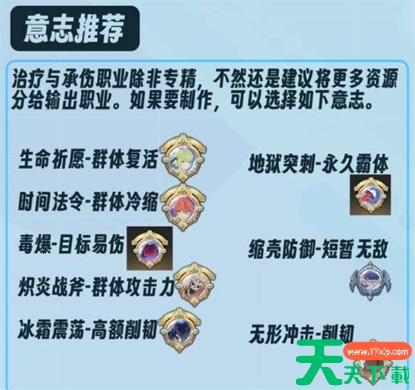 虽然奶T职业同样能携带意志,但由于意志核心偏向输出增益,资源投入性价比较低,不建议优先培养。以下为可选但非必要配置: