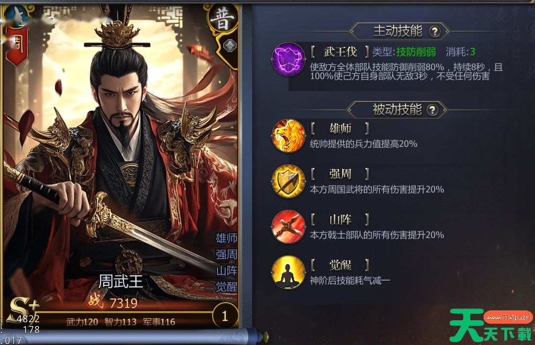 技能:使敌方全体部队技能防御削弱80%,持续8秒,且60%使己方全体部队普攻增强80%,持续8秒