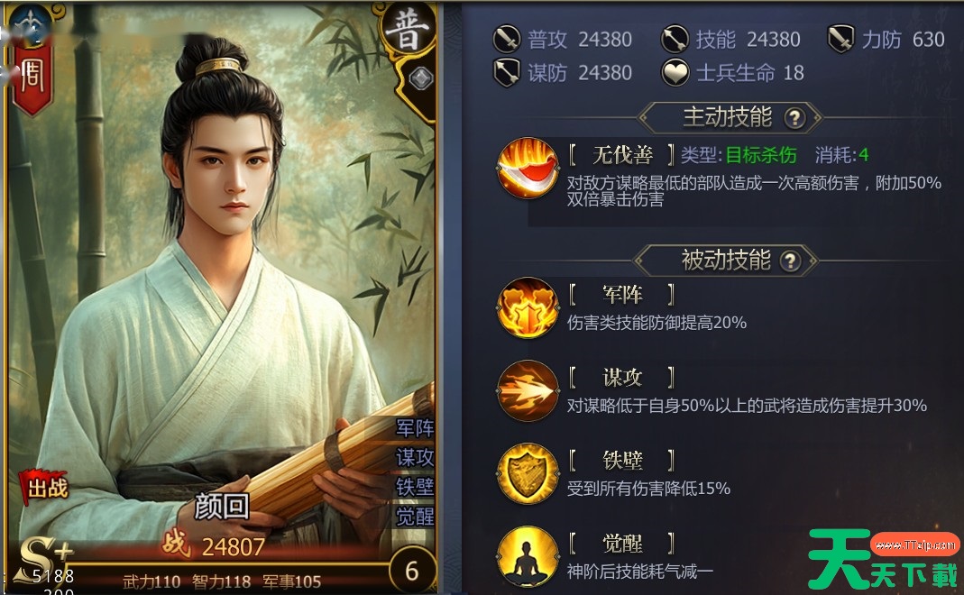 技能:对敌方谋略最低的部队造成一次高额伤害,附加50%双倍暴击伤害