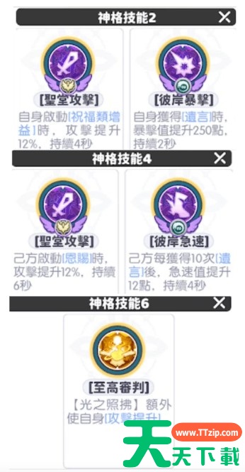 第三组阵容:圣堂嵌入埃及艳后,使用光龙,加百列奥义释放顺序往后移,确保既有【恩赐】,每次释放奥义前又能叠至5层【遗言】(预期)