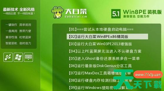 3、从U盘启动进入大白菜主菜单,按数字2或移动方向键选择”02“回车,运行PE系统。