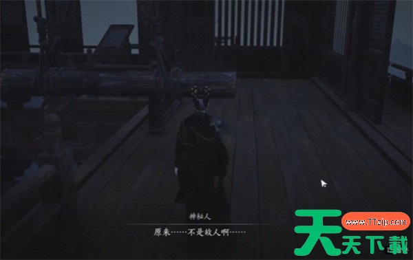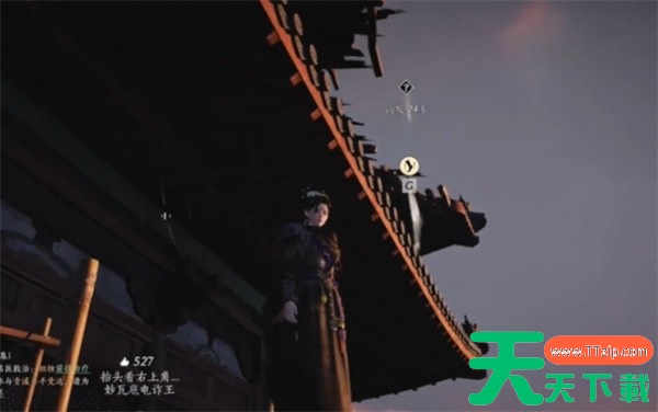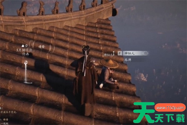敲钟后,继续向更高处攀登,来到建筑最顶层平台。在屋顶位置可发现一名神秘人,靠近后进行对话。