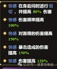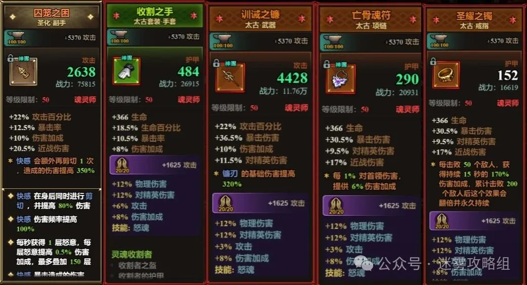 基本和上赛季的装备没变化,主要看圣化副手!5快感其作用才会最大化!很多玩家都会问:为什么别人的剪刀前后剪,而我的却只前面?就是因为快感会在身后进行剪切!虽然这里只有四快感,但已经很不容易了,而且圣化副手神语这里是血斗技能一定注意,咱们有近战戒指加成伤害远比怒魂要高!