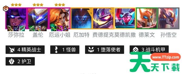 2、阵容羁绊:4精英战士+1怪兽+1堕落使者+3战斗机甲+2护卫。