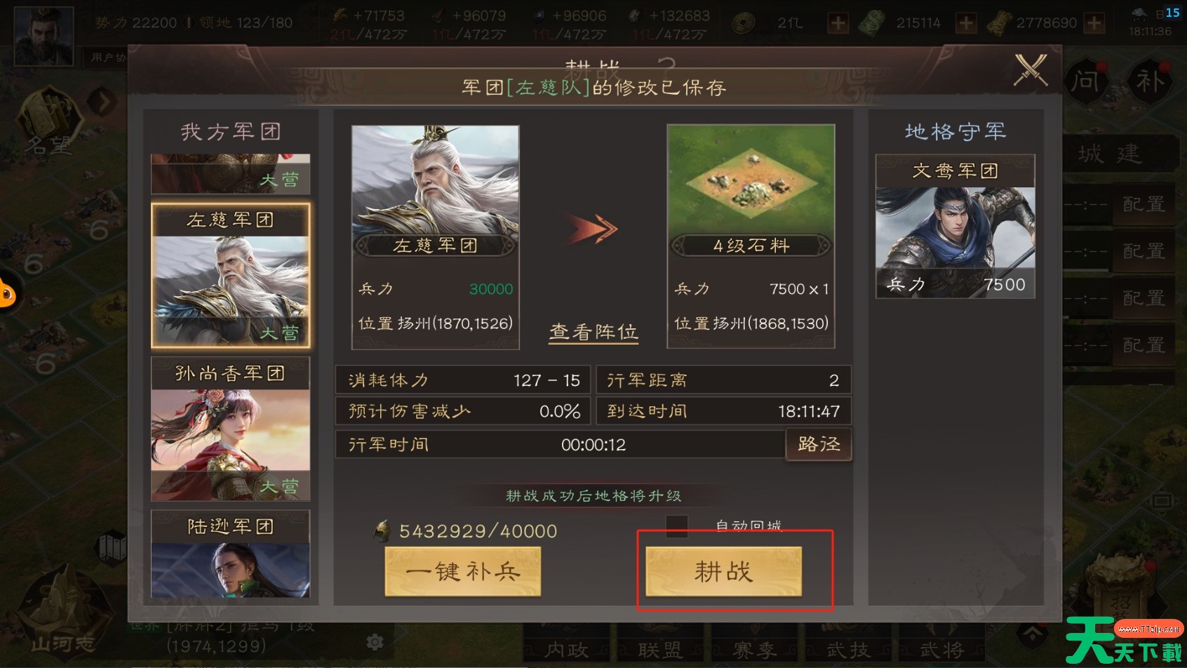 (4)耕战完成后自动转换为你升级的地块,势力值以及产量按照你升级的目标低来计算,举例,你4级地升级5级地,当你完成耕战时,你的势力值从60变成120.产量从900每小时变成1900每小时