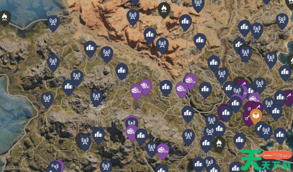 在打开地图之后,小伙伴们可以一目了然地看到这张地图上所出现的所有物资,包括武器箱、宝箱和一些矿产、皮毛,具体的位置在上面都会有着十分清晰的标注。如果说小伙伴们在前往野外进行探索的时候,需要寻找某些资源,但是不想自己探索,就可以直接打开互动地图,搜索他们所在的具体位置,然后直接前往,能够帮助大家节省下大量的时间。