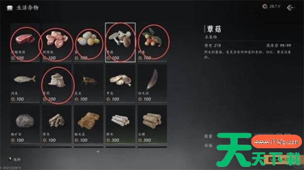 同样以生活材料为主,涵盖做菜与制药所需物品。无硬性必买内容,根据自身生活技能路线自由购买。