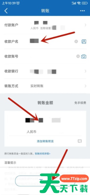 根据页面提示,录入收款账户名、账号、转账金额等信息,点击下一步。