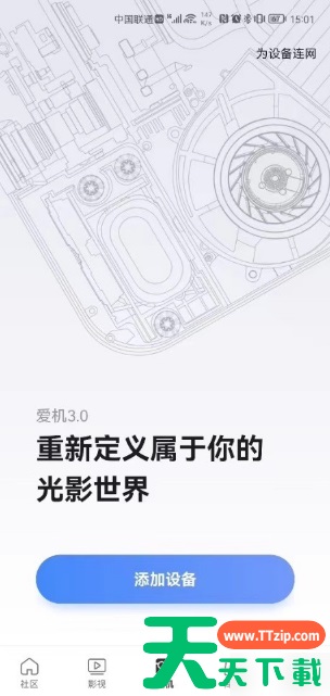 1、确认极米投影仪与手机连接同一个网络,打开手机的极米app,选择【爱机】,我们得到下图界面。点击中间【添加设备】,点击添加设备进入下一个页面。