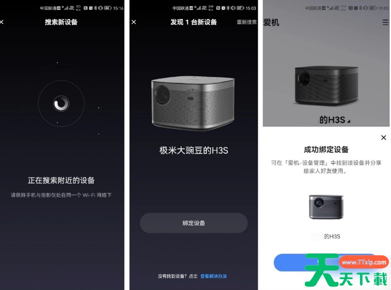 2、进入【添加设备】后画面如下图1所示,等待搜索一般等待5-20秒左右,搜索到设备后,再点击【绑定设备】。接着界面会提示您填写验证码,将极米投影仪画面显示的验证码正确输入,绑定成功。