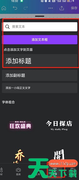 1、打开Canva可画app,创建一个新的画布,然后点击左下角的【+】,在弹出的选项中选择【文字】-【添加文本框】,如图所示: