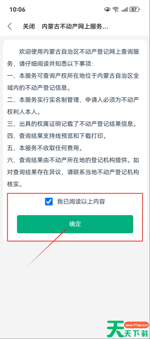 5.进入“有无房证明查询”专题后,点击页面中的查询按钮,勾选“我已阅读以上内容”后点击确定。