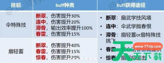 ②扇子轻蓄小龙卷伤害提升45%,而且小龙卷可以吃到断翠buff的40%伤害加成、紫心法春雷篇春雷buff15%伤害加成、惊春buff的20%伤害加成,共75%的buff伤害加成,伤害很高且不耗精元。