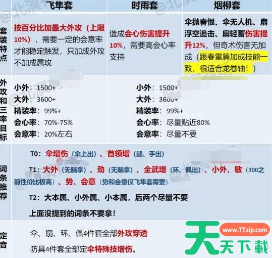 玉玉是会心流派(不懂属性的可以看我主页面板&调率攻略帖子),吃满天赋后伞弹道技能、扇浮空追击会心伤害提升36%,所以要以会心为主。套装可选三套: