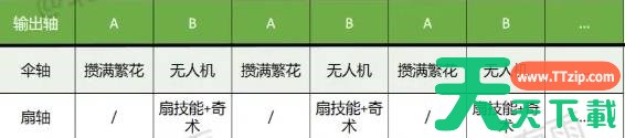 玉玉想要高输出,关键是确保伞特殊技无人机的覆盖率!即攒满繁花后放无人机,再切扇配合奇术打输出,无人机回收后继续切伞攒繁花,做成图大概如下图: