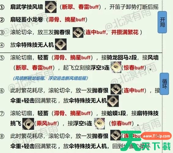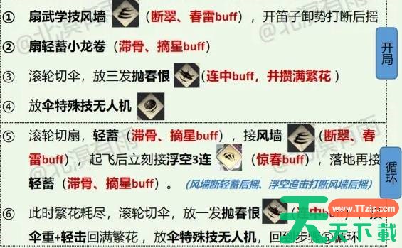 (一)伞轴的A段攒繁花,有两个方式:①抛春恨*3,开局用。②抛春恨*1+伞重、轻击,后续循环用。