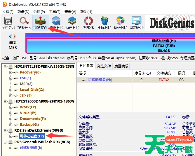 1、将需要恢复数据的U盘与电脑连接好,打开diskgenius软件,在软件选中该U盘,点击"恢复文件"按钮。