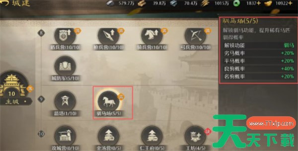 1、前期可将驯马场升级至3-4级后再进行驯马,避免获得低品质马匹。