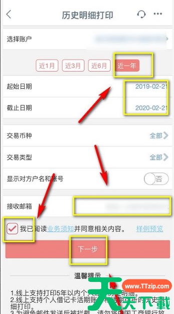 选择你的打印范围,接受邮箱,同意协议,点击下一步,如下图所示