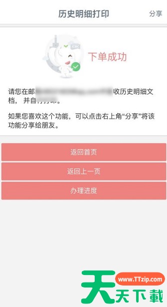 系统提示历史明细清单发送成功,去邮箱接收打印即可,如下图所示