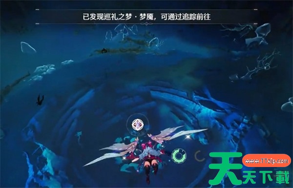 进入哀恸谷后,玩家需要寻找名为“巡礼之梦·梦魇”的目标。找到后,不要着急接近,先跳伞从高处直接降落到湖面上,这一步是触发梦魇凯尔匹出现的关键。湖面广阔且视觉效果清晰,降落时注意调整视角,确保准确着陆。