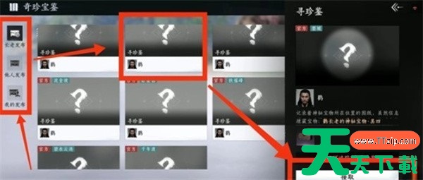 1、在【奇珍宝鉴】界面追踪鹳长老及其他游侠发布的「寻珍鉴」
