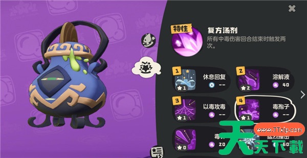 这一套技能组合非常适合嘟嘟煲的特性和属性,可以通过持续挂毒来消耗敌人的血量,而“休息”技能还能在需要时恢复生命,保持较强的耐久性。由于毒伤结算是以百分比的形式进行的,嘟嘟煲的特性可以让中毒效果结算两次,使得敌人不断受到高额的毒伤。