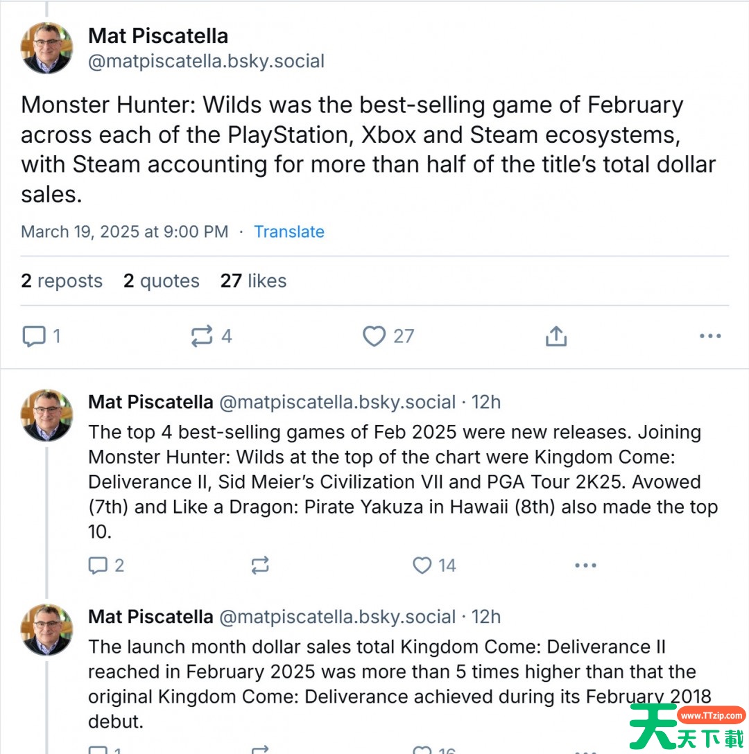 此外,Mat Piscatella还特别提到,天国拯救2在美国市场的首月销售成绩令人瞩目。与2018年2月发售的天国拯救相比,天国拯救2首月的销售额已经超过了前作的五倍以上,显示出续集相比于前作有着更高的市场热度和玩家关注度。