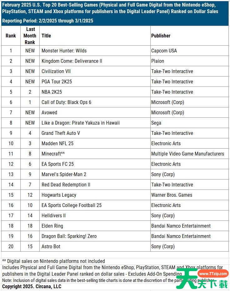 根据NPD的数据,美国地区2月的销售榜单(包括数字版和实体版的销量)排名如下: