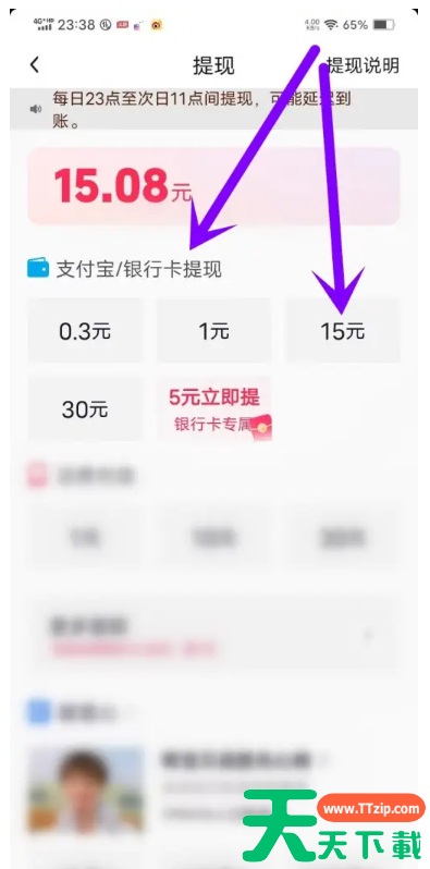 2、在提现页面,找到“支付宝/银行卡提现”选项,点击选择提现金额。