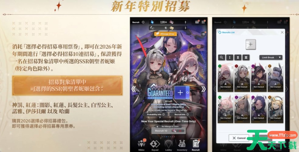 以上就是胜利女神国际服新春特别招募活动玩法介绍的全部内容了,希望玩家可以顺利的知道怎么进行抽取,更多精彩内容请关注天天下载(ttzip.com)。