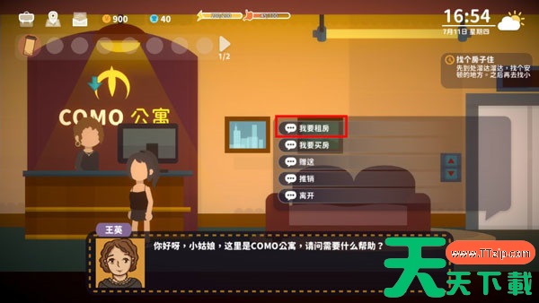 进入Como公寓后,您会在大厅前台找到NPC王英,她是负责公寓租赁事务的工作人员。走近她并与她互动,屏幕上会弹出多个对话选项。在这里,您需要选择“我要租房”,正式开启租房流程。王英会向您介绍公寓的租赁条件,并为您推荐适合的房间。