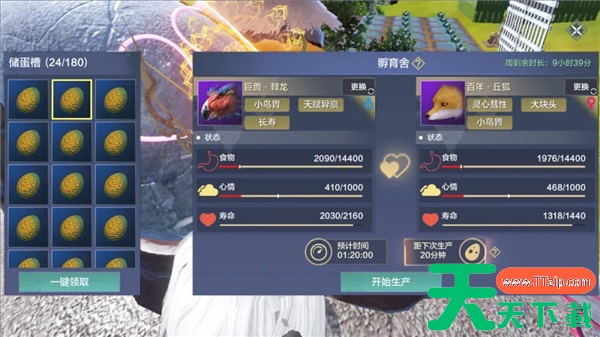 【孵育舍】是一个非常有趣且实用的建筑,激活后可以在庄院内摆放,提供一个专门的场所,用于畜牧动物的繁殖和孵化。在孵育舍内,玩家可以将两只性别不同的非幼年动物放置其中,通过繁殖系统,孵化出“失去活力的元胎”。需要注意的是,这些元胎主要用于宠物服炼,每个蛋孵化后会提供1至3点服炼值,供玩家在提升宠物等级和能力时使用。孵育舍有使用时长限制,每周最多可使用20小时,当使用时间达到上限后将无法继续生产。因此,玩家需要合理规划孵育时间,避免浪费。同时,孵育舍的储蛋槽最多可以存储180个元胎,达到上限后将停止孵化。为了确保孵育过程不被打断,玩家需要定期领取已孵化的元胎,以避免生产暂停。