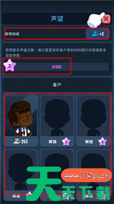 点击“星星”图标查看声望等级与进度,提升声望可获得尊贵客户,还能解锁装饰带来的额外现金加成。
