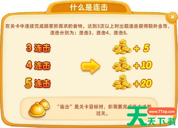 在小镇大厨游戏中,连击是提升游戏收益的重要机制。当大厨在关卡中连续完成顾客需求的食物时,就能触发连击效果。达到三次以上的连续上菜将激活连击状态,玩家可以获得额外金币奖励。最高连击可达五次,每次五连击将获得额外20金币。