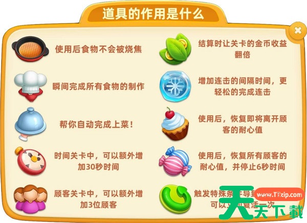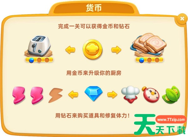 a. 金币:完成关卡后获得金币,用于升级厨房设备和食材。