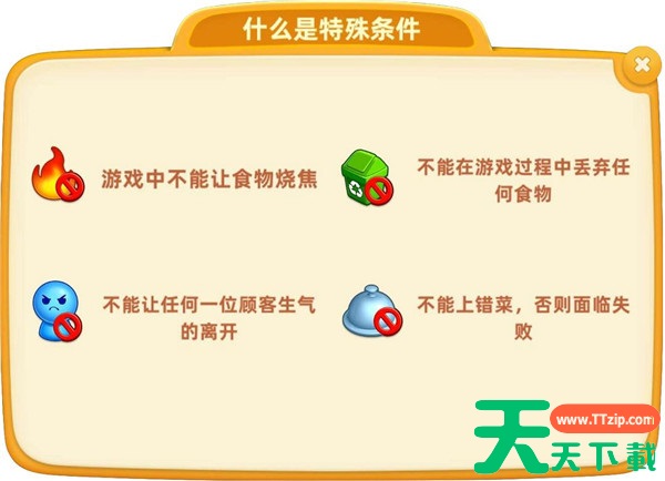 每个关卡可能会有特殊条件或限制,这些条件会影响通关方式。特殊条件如“不能烧焦食物”或“不能上错菜”等,都会在关卡开始时进行明确提示。一旦违反条件,关卡挑战即判定失败。因此,大厨需要格外注意这些限制,确保顺利完成任务。