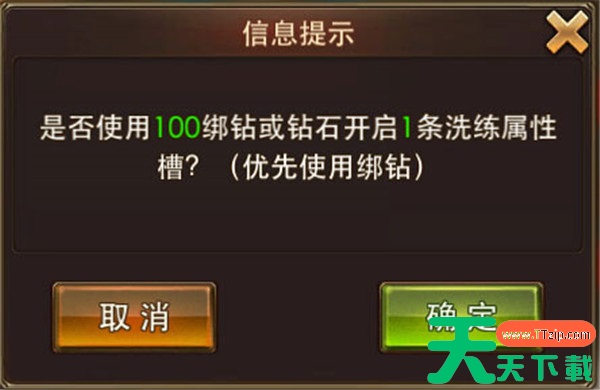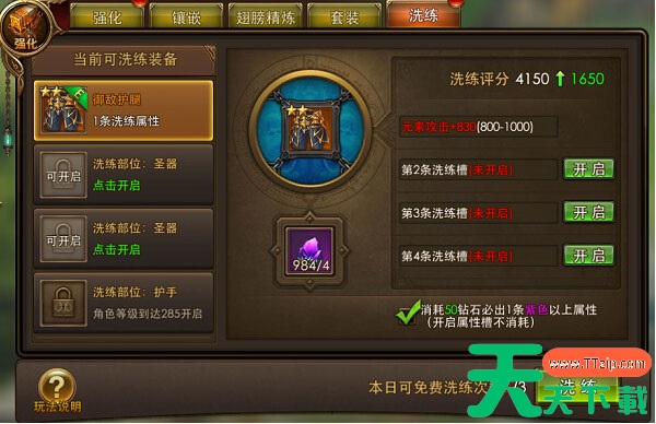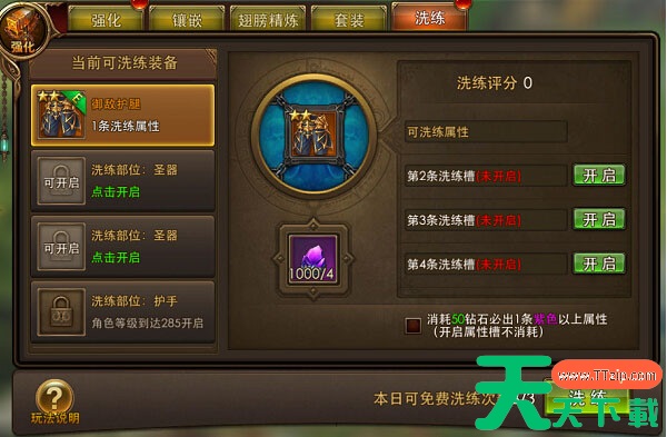 每件装备最多可以拥有4条洗练属性槽,玩家可以通过消耗100绑钻或钻石来开启一个新的属性槽。每次开启时,会自动生成一条新的属性,帮助你提升装备的战力。花费100钻石开启新槽的性价比相当高,是一种很值得投资的方式。