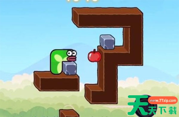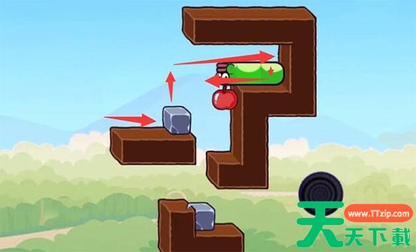 1. 首先,移动贪吃蛇,通过灵活操作,利用左侧的石头和苹果的互动,将右侧的石头推下去,然后吃掉苹果。注意,控制蛇的方向和姿势,确保石头能够顺利落下,并且尽量避免与其他障碍物碰撞。