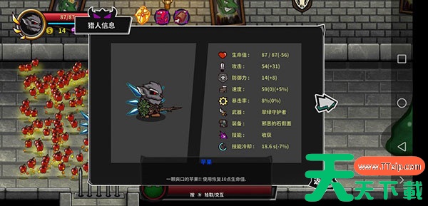 一 使用带有技能掉落苹果的武器,可以通过刷怪掉落苹果,确保持续恢复生命。如果开局没有刷到合适的武器,不必担心,可以通过退出游戏再重进的方式刷到你需要的武器。打小怪时要特别注意自己的血量,适当多刷苹果来保持生存。