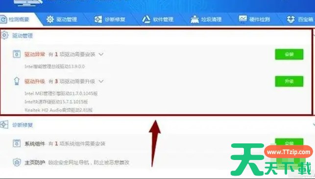 检测完成后,在界面底部找到并点击“驱动管理”选项,查看当前电脑中所有设备的驱动状态。